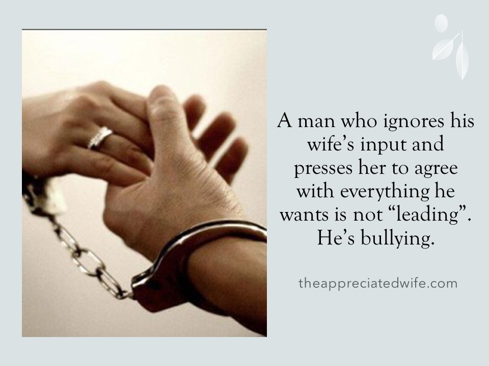 Well, according to the Bible, a godly husband will love his wife in a selfless way (Ephesians 5:25) and will treat his wife with consideration and respect (1 Peter 3:7). These verses give us a pretty clear picture of what a godly husband looks like. As a result, it seems pretty clear that a controlling husband, one who bullies or intimidates his wife and children, is NOT behaving in the way that God intended.