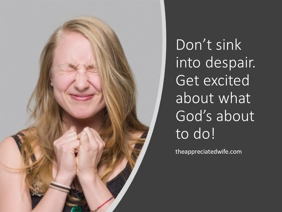 Maybe the Lord is planning to answer your prayers in a way that will blow your mind! When I’m in a time of discouragement or challenge, I like to give my concern to God in prayer and then encourage myself by saying this…”I can’t wait to see what God is going to do!!!”