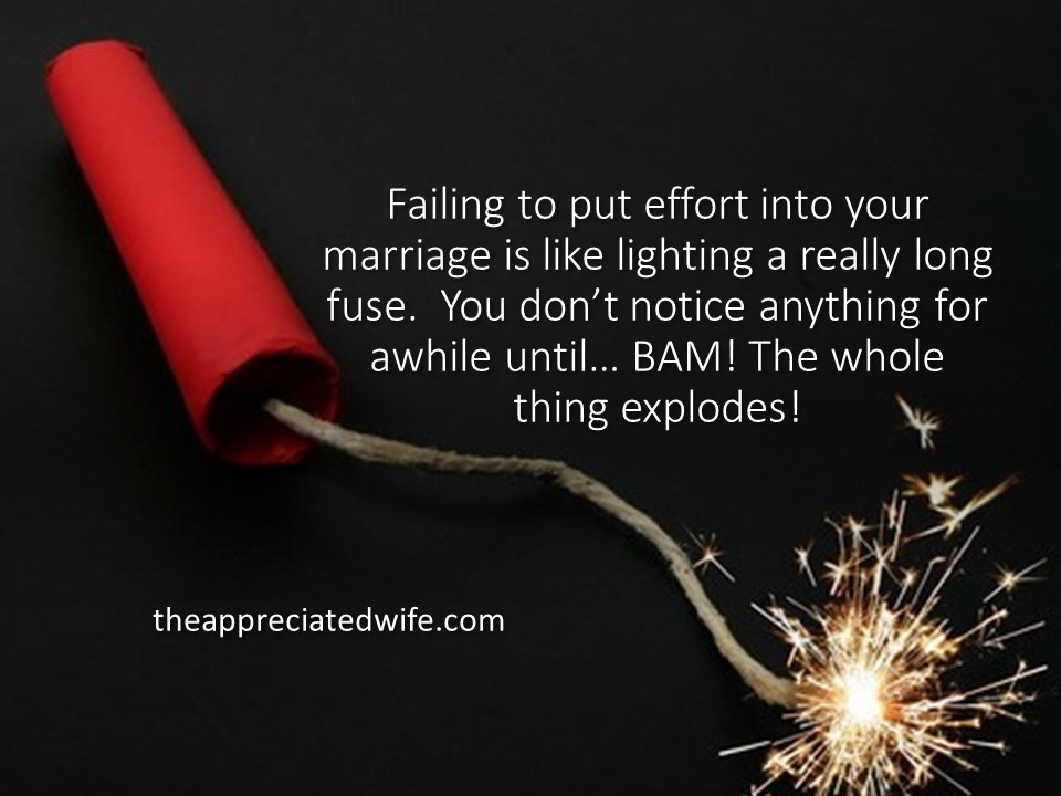 Laziness is kind of like lighting a really long fuse. You don’t really notice anything for the longest time….that is, until the explosion! Many a wife has been burned, ending up with a husband who seeks attention from other women or who even ends up divorcing her. We can’t afford to be sluggards in our marriages! The Bible has lots to say about sluggards. Proverbs 13:4 says “A sluggard’s appetite is never filled, but the desires of the diligent are fully satisfied.” This can be applied to your marriage! Only when you are diligent in investing in your marriage are you likely to have the kind of marriage you desire.