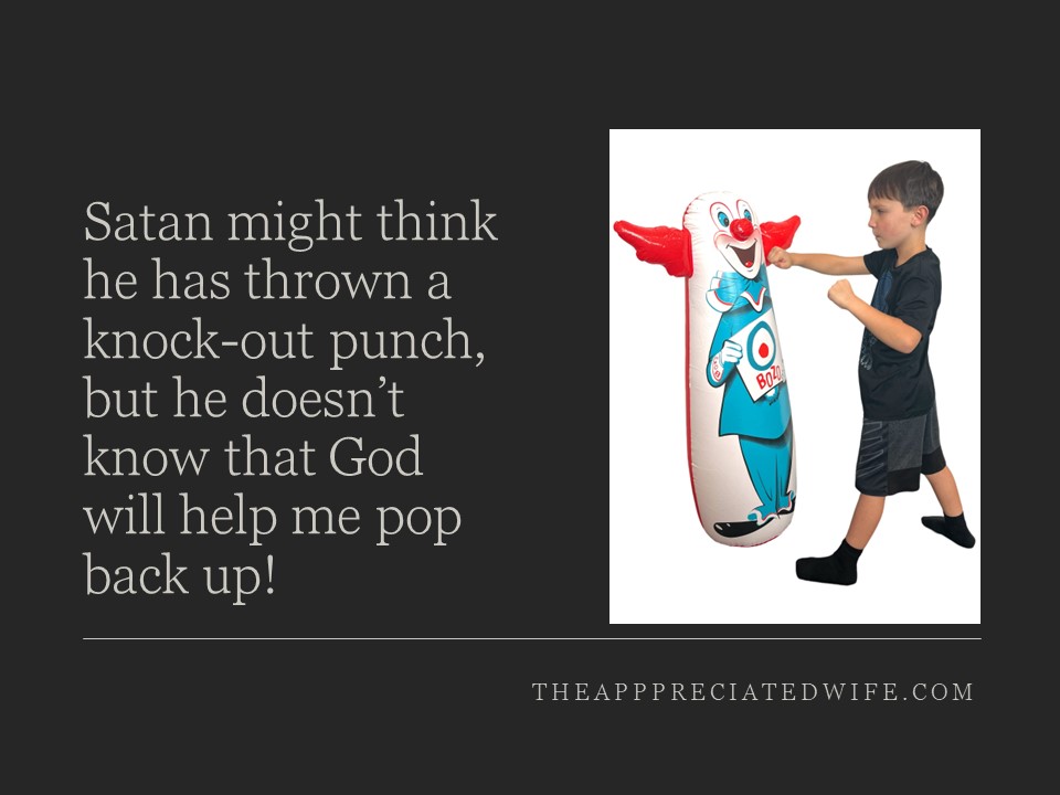 Now that I have decades of experience under my belt, I see quite an analogy between that bop bag and our walk with the Lord.  We ARE the bop bag!   Satan throws the punches.  But if we are smart, we’ve developed such a strong relationship with Jesus that he becomes the weight at the bottom of the bag that helps us pop back up after Satan has thrown a big punch!