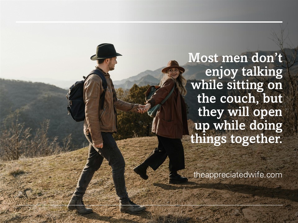 Men are wired differently than women. Duh! Most wives know that husbands have a deep need for respect. You probably also know that most husbands desire a vibrant sex life! But most husbands also have a third core need. One of the ways most men differ from us is that, instead of sitting and talking about their feelings and deepest longings, they like to do stuff. You may not realize it, but most husbands really want their wives to do stuff with them! They want to spend time with you. Their 3rd core need is your companionship.