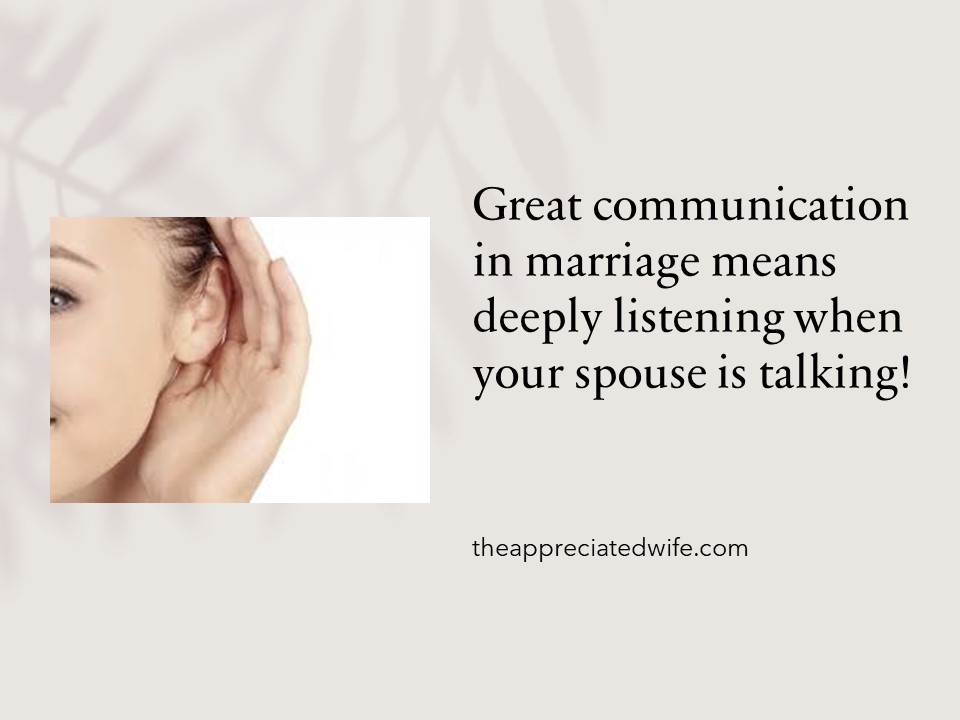 3. Careful listening:  Many communication problems could be solved if we were simply better listeners.  Often, we’re distracted and only partially paying attention to what our husband is saying.  Other times, especially during a disagreement, we aren’t paying any attention at all because we’re planning our wise rebuttal to whatever he has to say!  Great marriages benefit from carefully considering and respecting the other person’s point of view, not just our own.  Philippians 2:3-4 Do nothing from selfish ambition or conceit, but in humility count others more significant than yourselves.  Let each of you look not only to his own interests, but also to the interests of others.