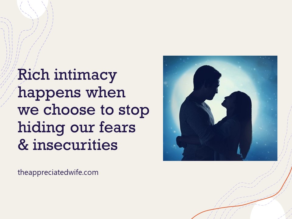 Wouldn’t it be great if you and I could stop spending energy trying to hide all our flaws, fears, and failures?  Most of us are in “hiding”.  You’re afraid that if anyone, including your husband, was to discover your flaws, they wouldn’t love you anymore.  Satan has convinced us that we need to hide who we really are. He whispers into your ear that your husband will look at you with disgust if he were to discover the real you.  Satan tells you your husband might even leave you.