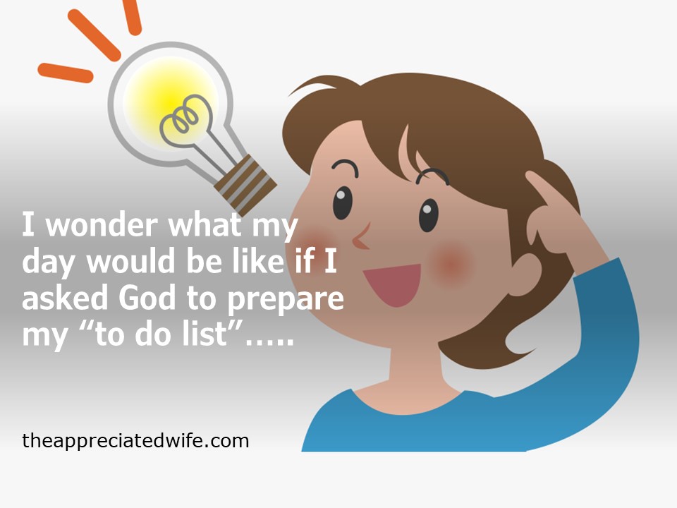 So, maybe you and I should stop being neurotic about our lists!  I am still making a list each day, but unless something on that list is absolutely critical, I’m allowing myself to skip some of the items in order to respond to my family or friends if I can see that they could use my help or encouragement.  If you’re a wife, I believe this adjustment could make you more like the 1 Peter 3 wife.  She is described as having a “gentle and quiet spirit”.  I don’t think she could be quiet and peaceful if she was running around like a chicken with her head cut off!  She obviously wasn’t a slave to a long to-do-list.   The question is:  Do you need to re-evaluate your lists?