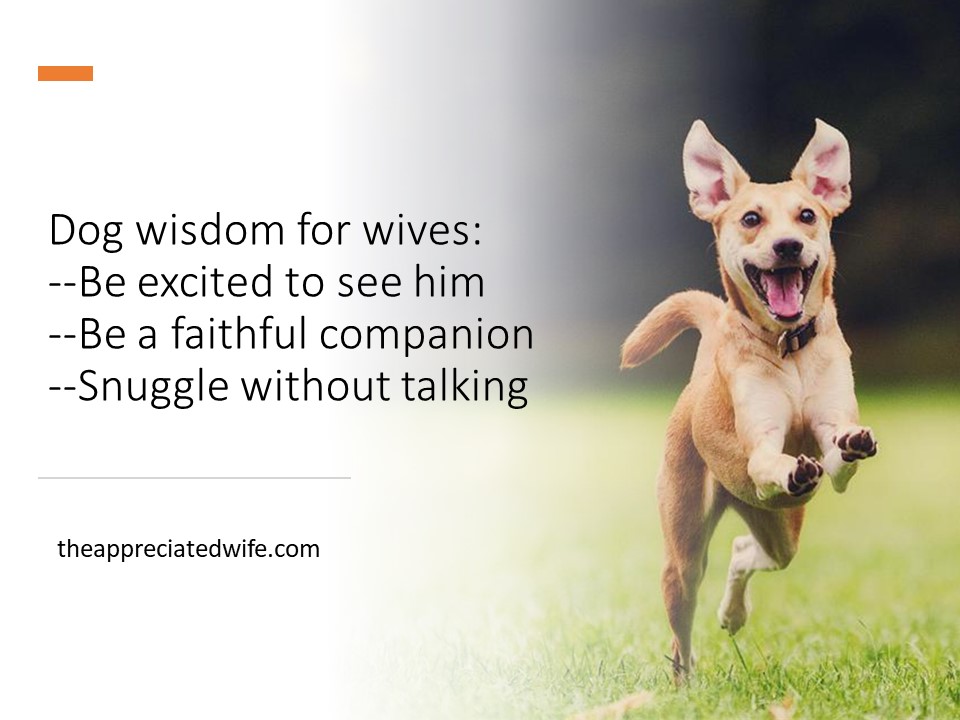 I can’t help but think wives could learn something from a man’s dog. (Yes, I’m saying this a bit tongue in cheek, but maybe a bit seriously too!) What if you, as a wife, rushed to the door and greeted your husband with love and excitement, just as a dog greets its owner when he comes in the door at the end of the work day? What if you, as a wife, were as eager to please as a man’s dog? What if you were as much a faithful companion to your husband as dogs are for their owners? What if you, like a lap dog, made it a practice of snuggling up close, without talking? The Bible actually has something to say about that. In 1 Peter 3:1, God says that “husbands may be won over without words by the behavior of their wives.” Hmmm. That’s something to ponder. Yep, perhaps there are a few lessons to learn from “a man’s best friend”….