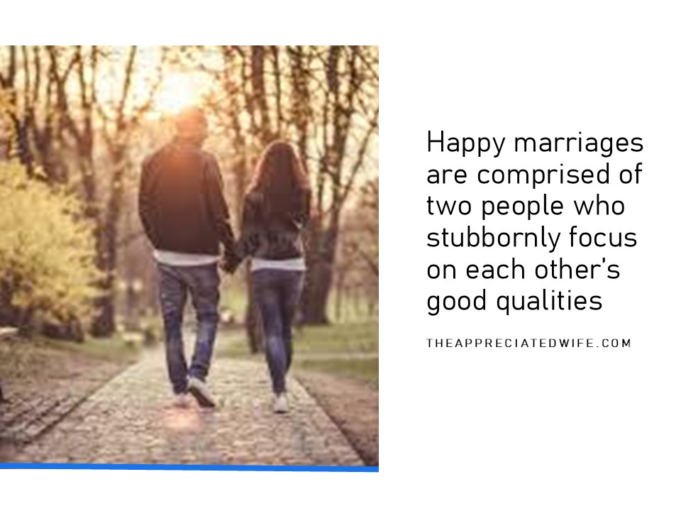 I’ve noticed something really interesting as I’ve interacted with hundreds of wives over the years.   The women who typically have the strongest, longest-lasting marriages are the women who CHOOSE to focus on what is right with their husbands instead of what is wrong.  These women also seem to have the most joy and contentment.  Wow.  Wouldn’t we all like that?!