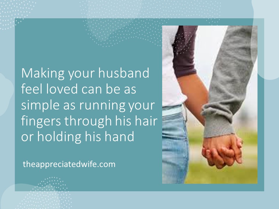 Here are several ideas on how you can communicate love through physical touch. Reach out to hold his hand as you walk through the store. Give him a 20 second neck and shoulder rub as you’re walking by. Pinch his tush as he walks through the kitchen. Lean over his shoulder while he’s on the computer and give him a kiss. Rest your hand on his leg while you’re sitting together on the couch watching TV. Run your fingers through his hair. These small acts of physical touch are totally easy and yet they mean so much to most husbands. Try it!