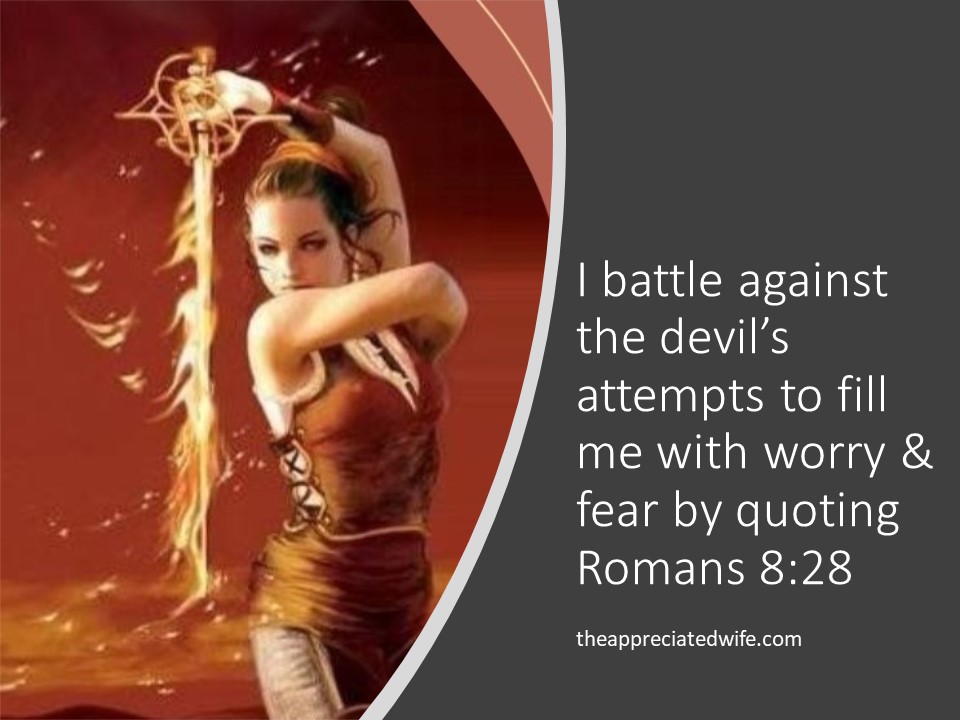 4. Romans 8:28  “And we know that God works all things together for good for those who love him”  This means that I remind myself that even if my worst fear comes to pass, God can still bring something good out of that situation.  That brings me comfort.