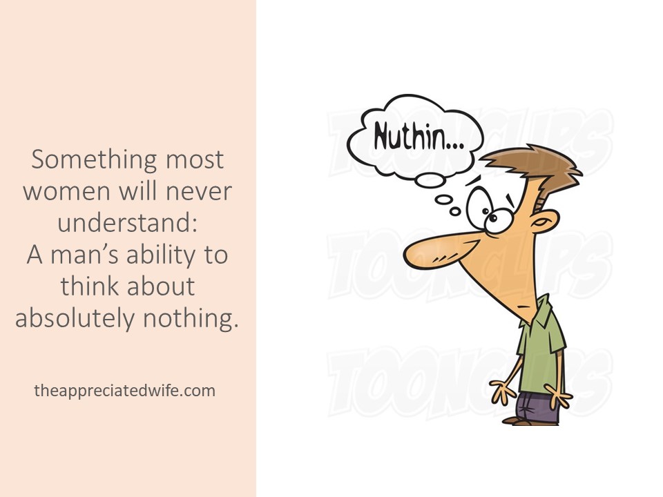 It’s hard for women to understand a man’s need for his “nothing box” because most women don’t even know what one is!  I’ve had a few men explain it to me in two different ways.  It can refer to most men’s uncanny ability to think about absolutely nothing…to completely zone out! It can also refer to a man’s need to have down time where he can veg.  Here’s the basic idea.  After a long day at work, most men need to enjoy either quiet or mindless activity in order to decompress from their day.  This means your husband probably doesn’t want to hear the fascinating details of your day as soon as he walks in the door and he probably doesn’t want to talk about his day either…at least not for a while.