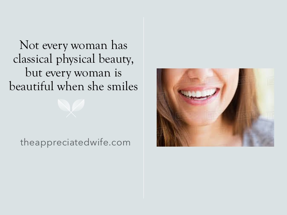 Another interesting thing I learned is that most of the men agreed that what makes their wife especially attractive (other than physical beauty) is being joyful and happy.  Wow!  That is something we have control over.  The saying “happy wife, happy life” is apparently very true!  One husband said he finds his wife beautiful when she smiles.  Another husband said he finds his wife especially attractive when she seems happy and filled with joy.  Proverbs 17:22 puts it this way, A cheerful heart is good medicine, but a crushed spirit dries up the bones.